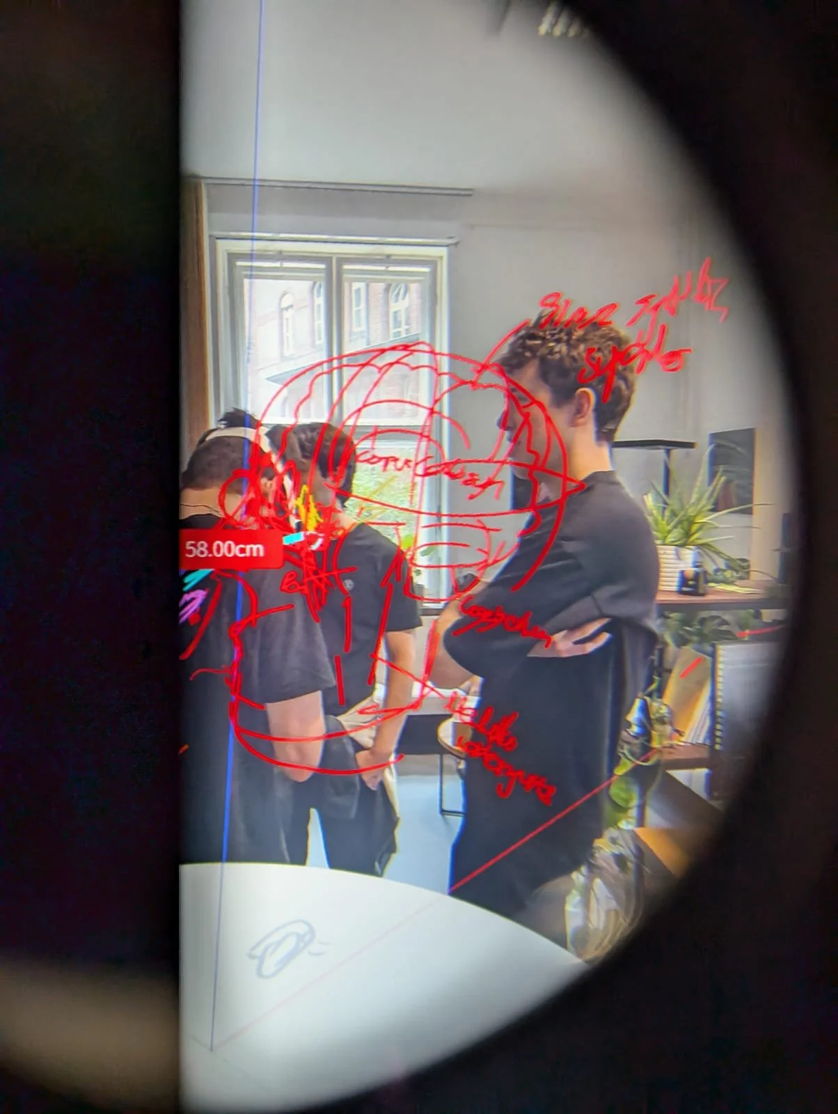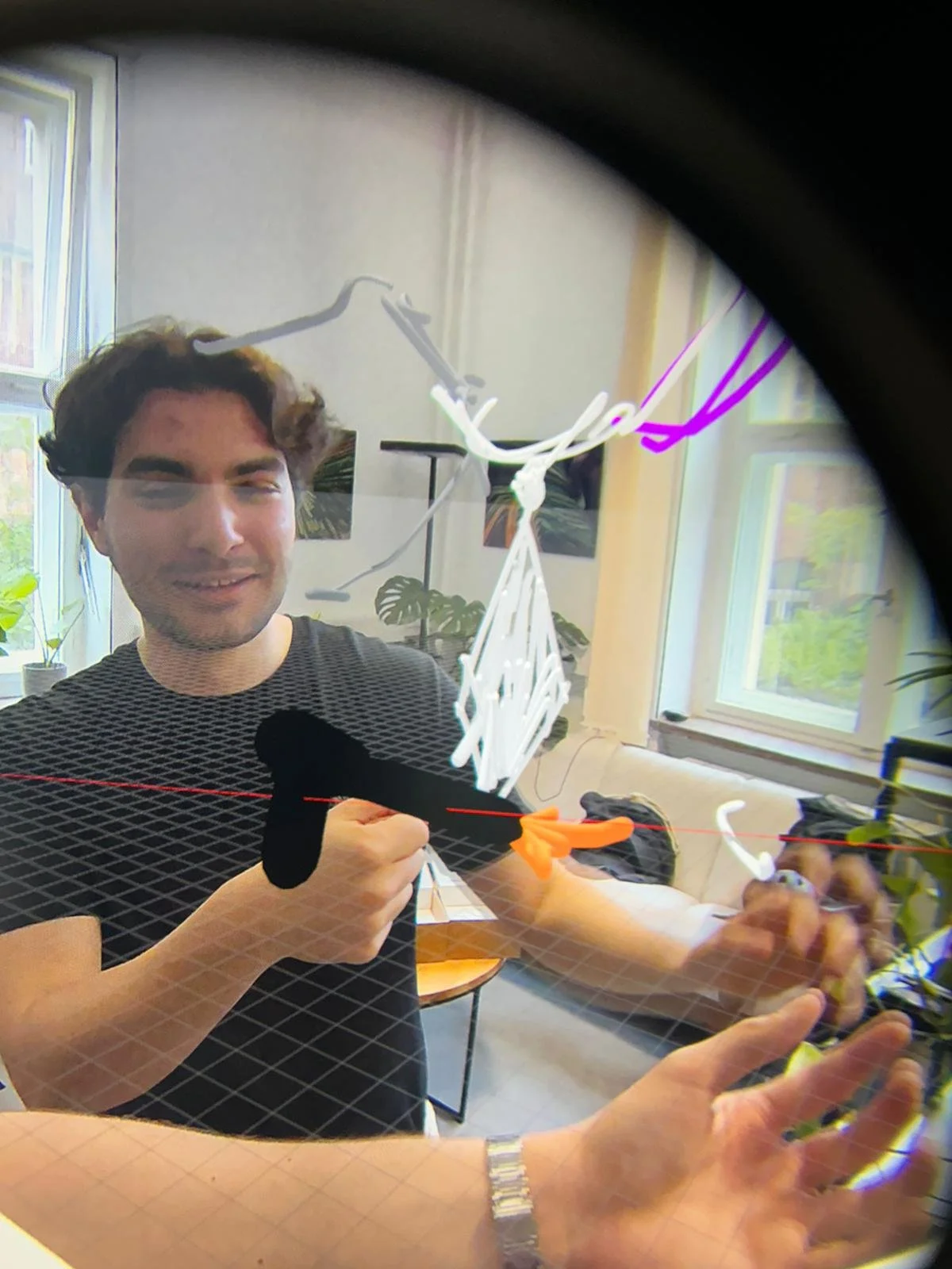 The technological infrastructure was difficult to deal with at first, but with some inventive ways of overcoming a problematic internet connection, we were able to have participants share virtual rooms while moving around the same physical space. The new SpecLab space is a perfect playground for collaborative 3D sketching interactions. We hope to keep it as empty and spacious as possible. With the pass-through technology of the newer standalone headsets, we didn't have to worry about collisions. This gave the typical virtual reality technology a hint of what augmented reality might look like: the user is no longer alone, secluded in the headset. A wide range of shapes and materials were tried out that day, from arterial visualisations to images of neural forests and cartoon characters.