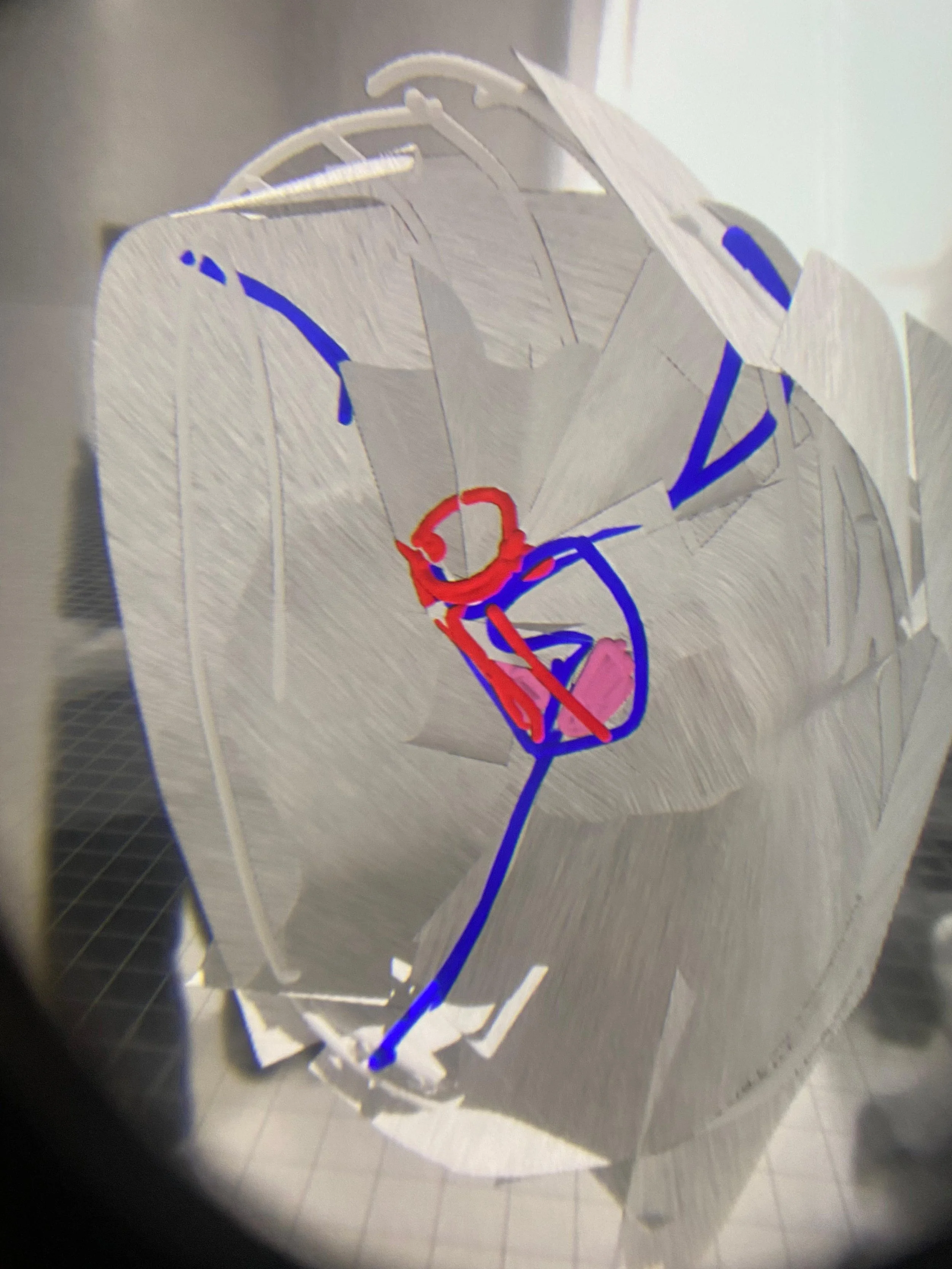 In the next room, on the other side of the wall, I was organizing a very rudimentary 3D sketching workshop using the commercially available app Gravity Sketch. The students ended up creating collaboratively a fuzzy scene, with a parrot and a palm tree, and lots of other scribbles.